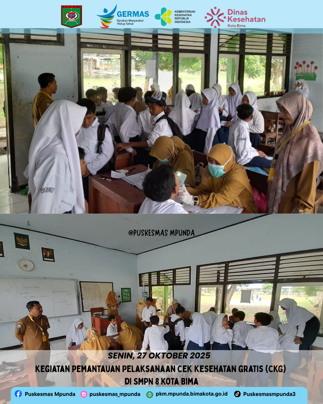 Senin, 27 Oktober 2025, Puskesmas Mpunda melaksanakan Pemantauan Pelaksanaan Cek Kesehatan Gratis (CKG) di SMPN 8 Kota Bima, dipimpin oleh Kepala Puskesmas Mpunda, Bdn. Suharti, SST, bersama Kasubag TU, Abdullah, SKM. Pemeriksaan kesehatan dilakukan oleh tim medis Puskesmas Mpunda secara gratis bagi seluruh siswa.