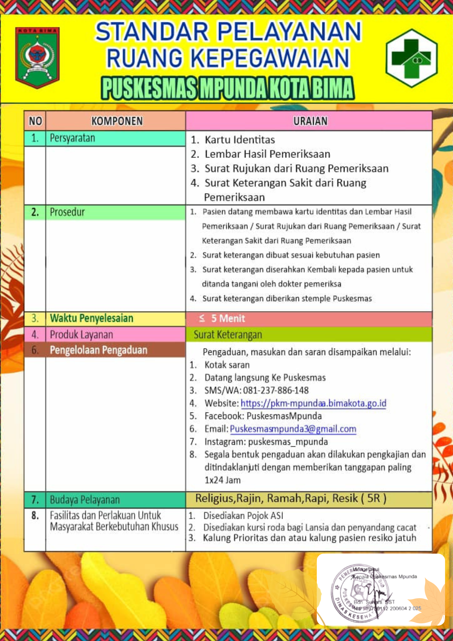 2. Pengumuman / STANDAR PELAYANAN RUANG KEPEGAWAIAN PUSKESMAS MPUNDA